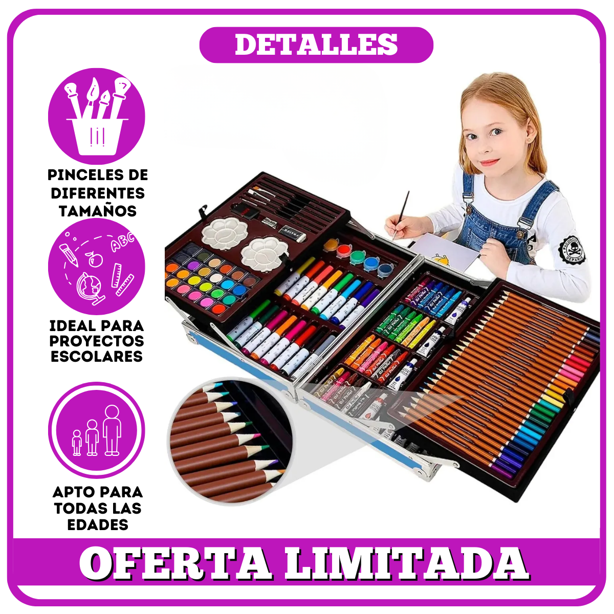 Este set no es cualquier set de arte, es el kit completo que transforma el tiempo libre en pura creatividad y diversión. Ya no más frustraciones con materiales incompletos o de baja calidad. Cada pieza está pensada para:
