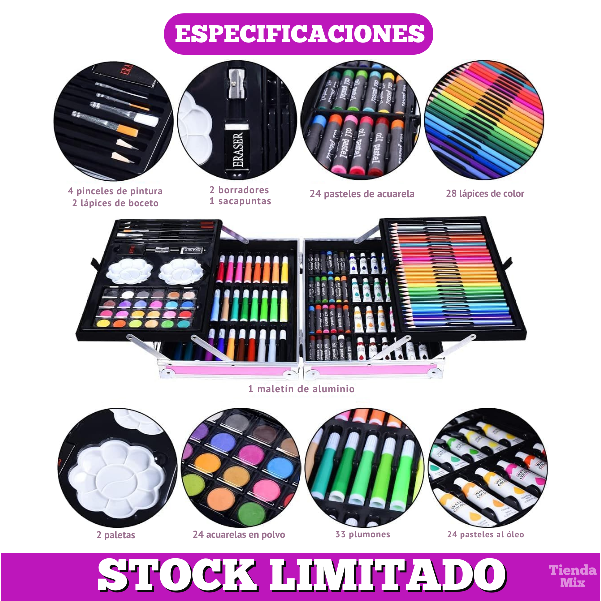 Set de Arte 145 piezas en maletín metálico, obtendrás: